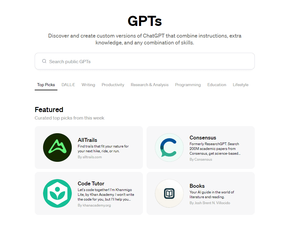 GPTji so razvrščeni v kategorije DALL-E, pisanje, produktivnost, raziskave in analize, programiranje, učenje in lifestyle. Med izpostavljenimi in najbolj uporabljenimi GPTji najdemo Consensus ki pomaga iskati po akademskih člankih, Ai PDF ki pomaga brati do 2GB velike PDF datoteke, še en PDF GPT AskYourPDF Research Assistant, Grimoire, ki je coding wizard in druge. Najdemo takšne, ki so povezani z zunanjimi orodji Rank Math za SEO članke, Canva za slike in prezentacije, celo takšnega, ki je namenjen iskanju GPTjev (meta, ni kaj) in Mio, ki je vaša prijateljica, ter RIZZ (boomer much?), ki vam pomaga pri žicanju fantov in punc na socialnih omrežjih.
