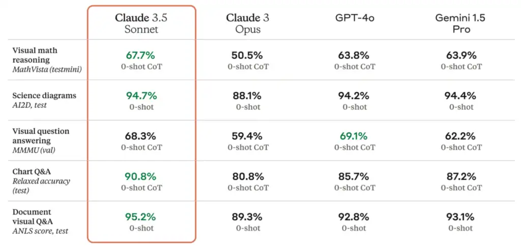 Vidik — analiziranje fotografij — je področje, kjer se Claude 3.5 Sonnet močno izboljša v primerjavi s 3 Opus, po navedbah podjetja Anthropic. Claude 3.5 Sonnet lahko natančneje interpretira grafe in diagrame ter prepisuje besedilo iz “nepopolnih” slik, kot so slike z izkrivljanji in vizualnimi artefakti.