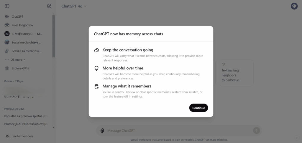 Do sedaj smo uporabljali funkcionalnost Custom instructions, v katero smo dodali navodila, kako naj deluje, sedaj pa izgleda, da si bo Chat GPT sam zapomnil, kakšni odgovori so nam všeč in bo vse svoje odgovore prilagajal.