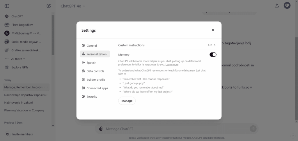 Kar je pomembno je, da lahko stalno nadzorujete kaj si je Chat zapomnil in brišete posamezne postavke. Do vsebine tega, kar si je Chat GPT zapomnil o vas lahko dostopate preko settings, personalization, kjer lahko spomin izključite, ali pa urejate (manage) posamezne postavke.