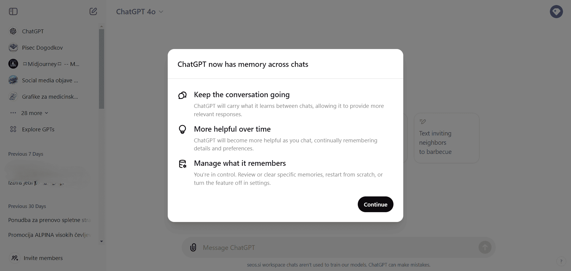 Že v začetku leta so pri OpenAI napovedali novo funkcionalnost Spomin, vendar smo uporabniki le počasi videvali to funckcionalnost v živo. Sedaj pa izgleda, da dobivamo to tudi uporabniki_ce v Sloveniji, saj jo lahko sedaj vidim tudi sam, kot uporabnik Teams paketa Chat GPT.