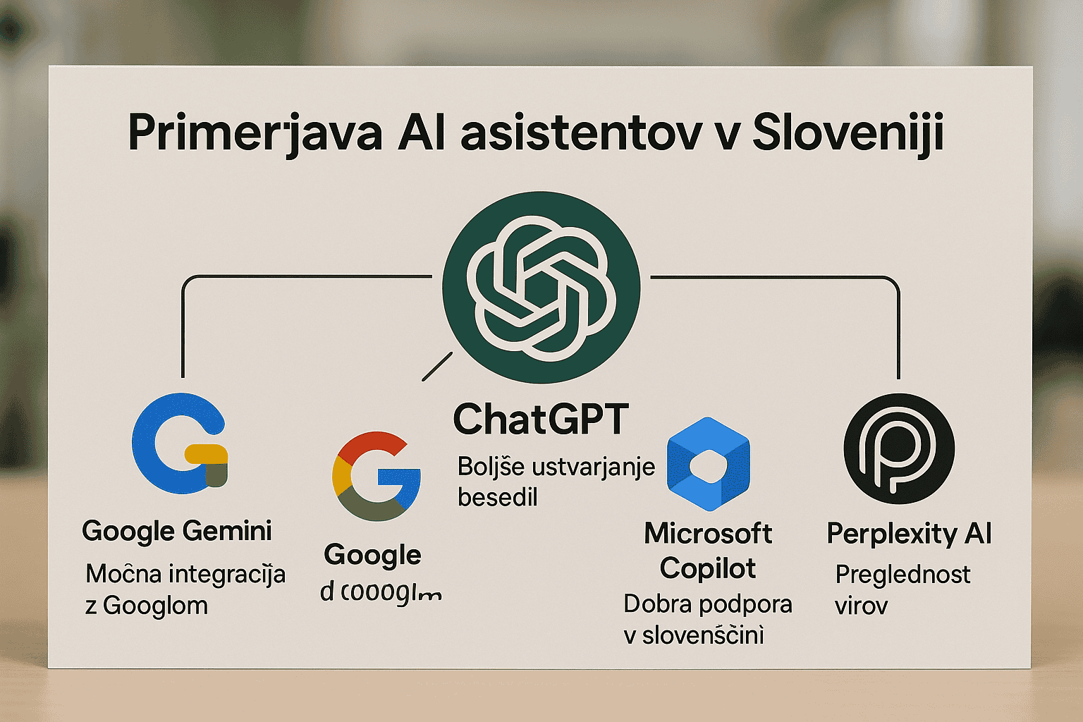 Google Gemini: Prednost je tesna povezanost z Googlovim ekosistemom. Gemini omogoča neposredno dostopanje do najbolj aktualnih informacij iz iskalnika in boljše upravljanje s koledarjem, dokumenti ali elektronsko pošto. Slabost je pogosto manj naraven pogovor v slovenščini, še posebej pri bolj zapletenih vprašanjih ali zahtevnejših temah. Ni najboljša izbira, če potrebujete strukturiran odgovor ali kreativno pisanje.