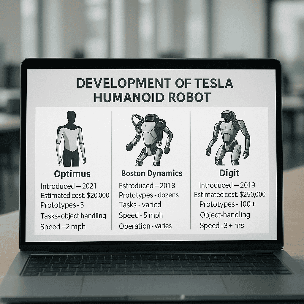 **Konkurenti, kot so Boston Dynamics, Agility Robotics (robot Digit), Figure AI in Samsung**, sledijo različnim pristopom: nekateri se osredotočajo na mobilnost in atletske sposobnosti (Atlas), drugi na zanesljivost, nizke stroške ter preprosto integracijo v industrijsko okolje (Digit). Tesla je specifična zaradi **avtomobilskega pristopa**, kjer želi tehnološke rešitve, razvite za električna vozila in avtopilote, prenesti tudi v robotiko.