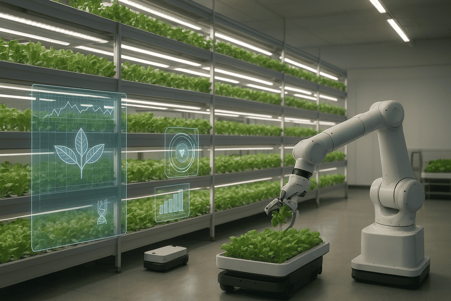 Avtomatizacija z UI prinaša notranjim kmetijam izjemno natančnost in učinkovitost. Podjetja kot Infarm, Plenty in Bowery uporabljajo robotske sisteme, ki temeljijo na algoritmih strojnega učenja za optimizacijo poti premikanja robotov, avtomatsko sajenje in žetev ter spremljanje zrelosti pridelkov s pomočjo računalniškega vida. Takšne rešitve so v nekaterih primerih zmanjšale stroške dela tudi do 60 odstotkov. Na primer, Plenty s svojo UI-platformo omogoča neprekinjeno optimizacijo delovnih procesov in trajnostno povečanje pridelave brez povečanja števila zaposlenih.